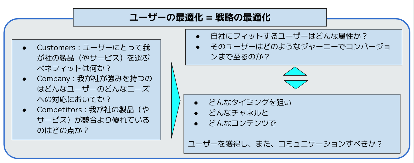 ユーザー最適化は戦略の最適化なので、推進するには以下のような戦略設計が必要になります。