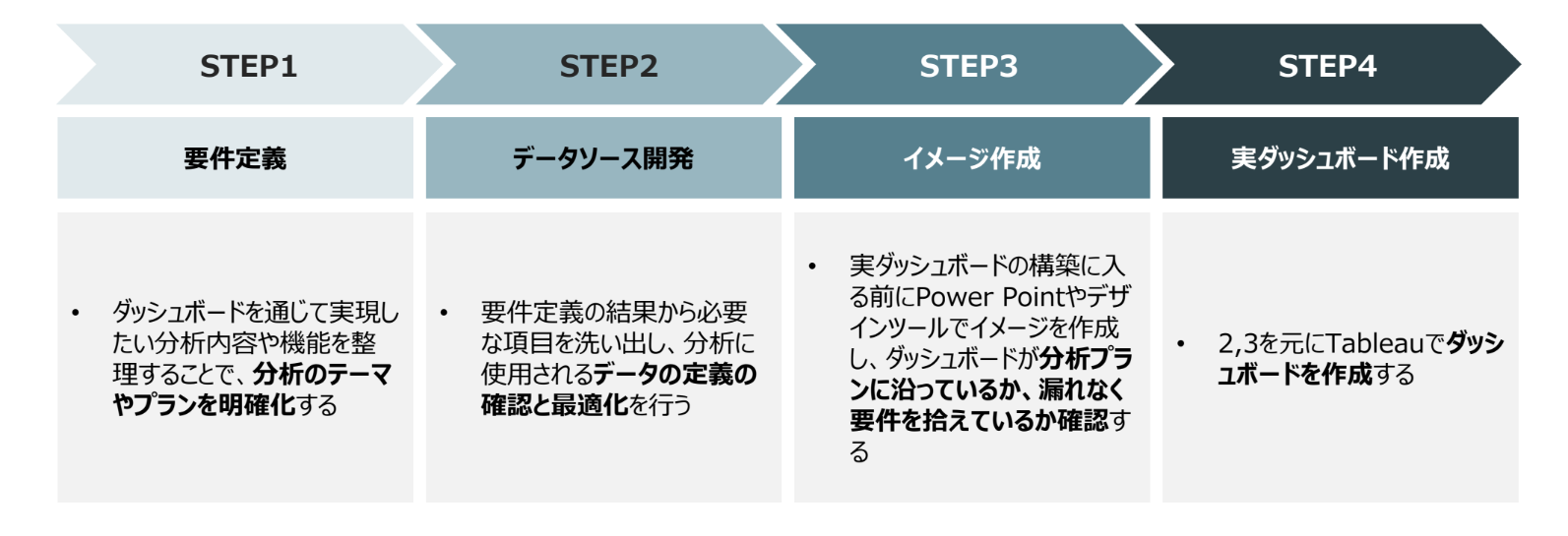 その後、実ダッシュボードの構築に入る前にPowerPointやデザインツールでイメージを作成し、ダッシュボードが分析プランに沿っているか、漏れなく要件が拾えているか確認します。