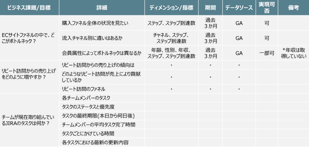 KGI/KPIの確認やプライオリティの高い課題を洗い出し、以下のように、実現したいこと・指標・期間を設定して、ビジネス課題一覧リストにして整理します。