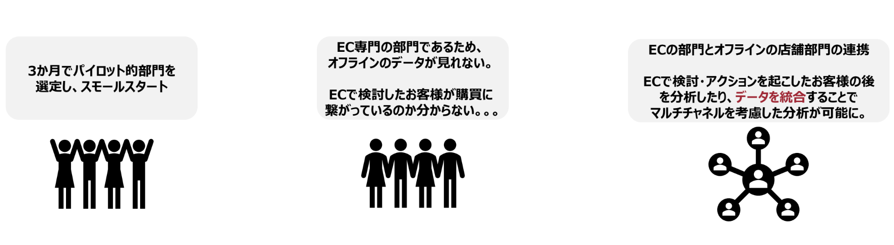 - 応用的な分析を実現するために、他部門のデータとの統合を図る。