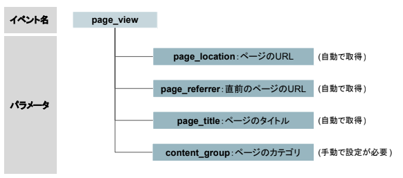下の図はイベント名「page_view」に紐づく4つのパラメータの例です。