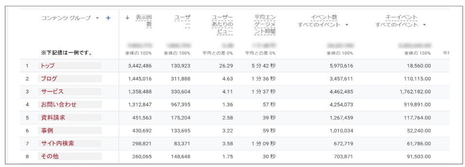コンテンツグループ別に比較すると、ブログの平均エンゲージメント時間の方が長いことがわかります。つまり、コンバージョンユーザーの関心が高いコンテンツはブログであることが判明します。