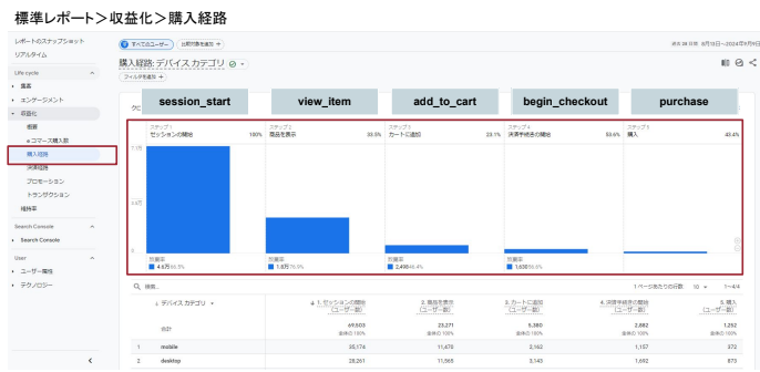 このとき例えば、ステップ4の「決済手続きの開始」をbegin_checkoutではなく、独自のイベント名で取得していると、数値が表示されないということが起こります。Googleが推奨しているイベント名で実装することが非常に大切です。