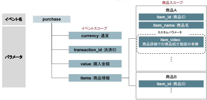 GA4のデータ構造がイベントと、パラメーターという構造になっていると前述しました。上の図では、purchaseというイベント名に対して複数のパラメーターが紐づいている形になっています。Eコマースイベントについては、itemsパラメーターを付与することで、商品情報の中に商品スコープという形でitem_name、item_brandのようなさらに詳細な商品情報を設定することが可能です。