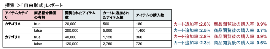 こちらも同様に探索ツールの「自由形式」レポートを使用します。ピンクのディメンションがアイテムのカテゴリーです。グレーの指標には、閲覧されたアイテム数とカートに追加されたアイテム数、アイテムの購入数を入れます。これをそれぞれ割り算していくと、カート追加率や商品閲覧後の購入率などを計算できます。これらを比較することによって、商品紹介動画がカート追加率に貢献しているのかを確認できます。