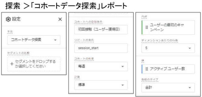コホートの登録条件を初回接触、リピートの条件をセッションスタートとし、内訳をユーザーの最初のキャンペーンにします。