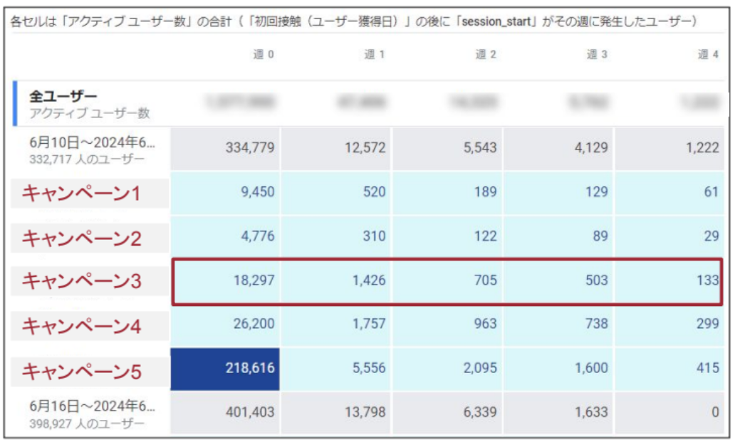 - 可視化される情報:各キャンペーンによって獲得されたユーザーの1週間ごとのサイトの再訪状況