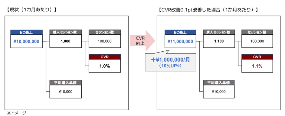 例えば、月間セッション数10万、CVR1.0%、平均購入単価1万円のECサイトでは、月間売上は1,000万円です。CVRがわずか0.1%上昇するだけで、売上は月間100万円増加し、EC売上全体が10%アップします。