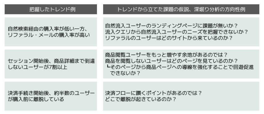 以下は「把握したトレンド例」と「トレンドから立てた課題の仮説、深堀り分析の方向性例」をまとめたものです。