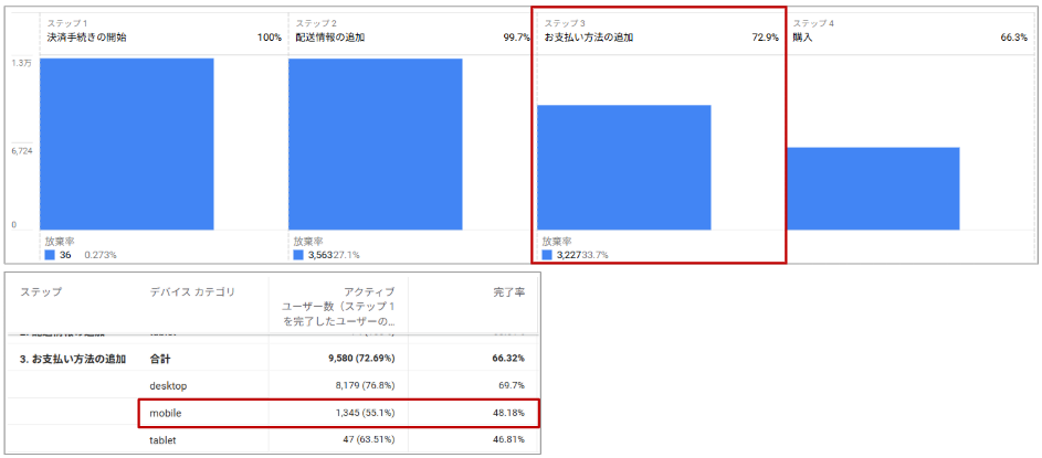 これを見ると、支払い方法を追加する時の離脱率が最も高く、特にその中でもモバイルユーザーの離脱率が高いということが分かります。この結果から、「モバイルビューで支払い情報を入力するフォームに改善余地がありそう」等の当たりを付けることができます。