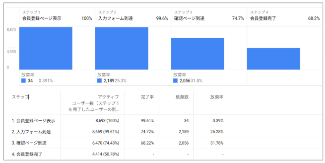 - 可視化される情報:任意の開始ステップ、次のステップ、到達ステップの離脱状況