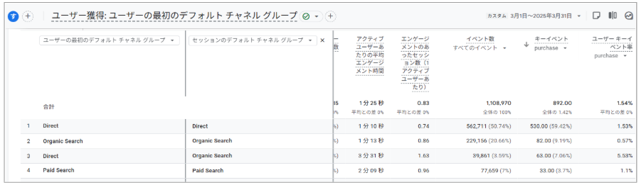 ユーザーが初めてサイトを訪れた際の流入経路を表す「ユーザーの最初のデフォルトチャネルグループ」というディメンションに、セカンダリディメンションとして「セッションのデフォルトチャネルグループ」を追加しています。