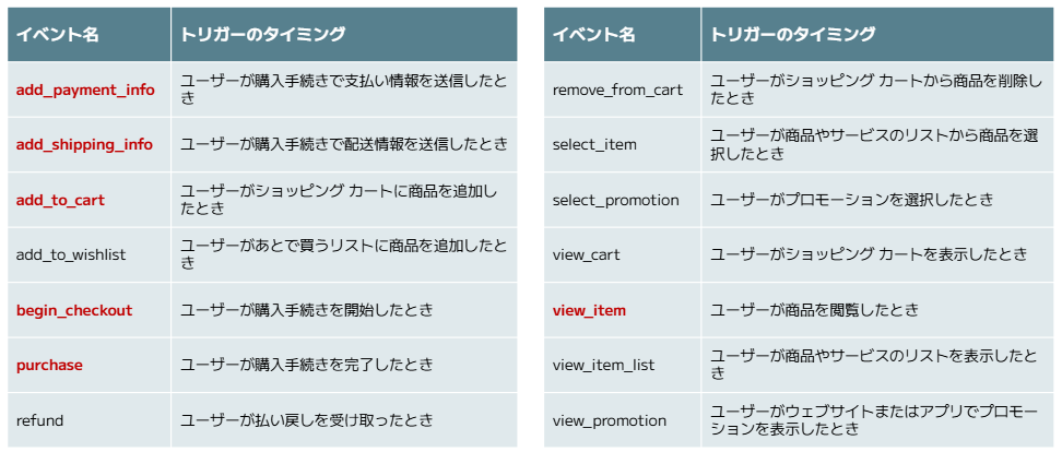 下記の名称のイベントを取得すると、eコマースイベントとしてGA4に認識されます。特に赤字のイベントは標準レポートで確認可能になるため、実装をおすすめします。