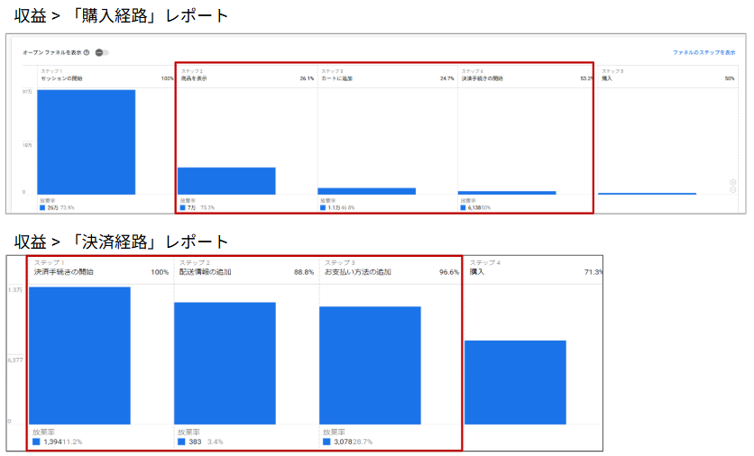- 購入経路レポート:流入から購入までの離脱率等