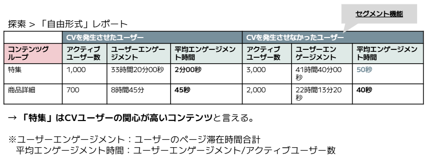 例えばコンテンツグループを、「特集」や「商品詳細」等でグルーピングしておくと、それぞれのコンテンツグループのパフォーマンスを見ることができます。これをセグメントと掛け合わせると、「どのページグループがCVユーザーの関心の高いコンテンツなのか」などのよりリッチな示唆が得られるようになります。