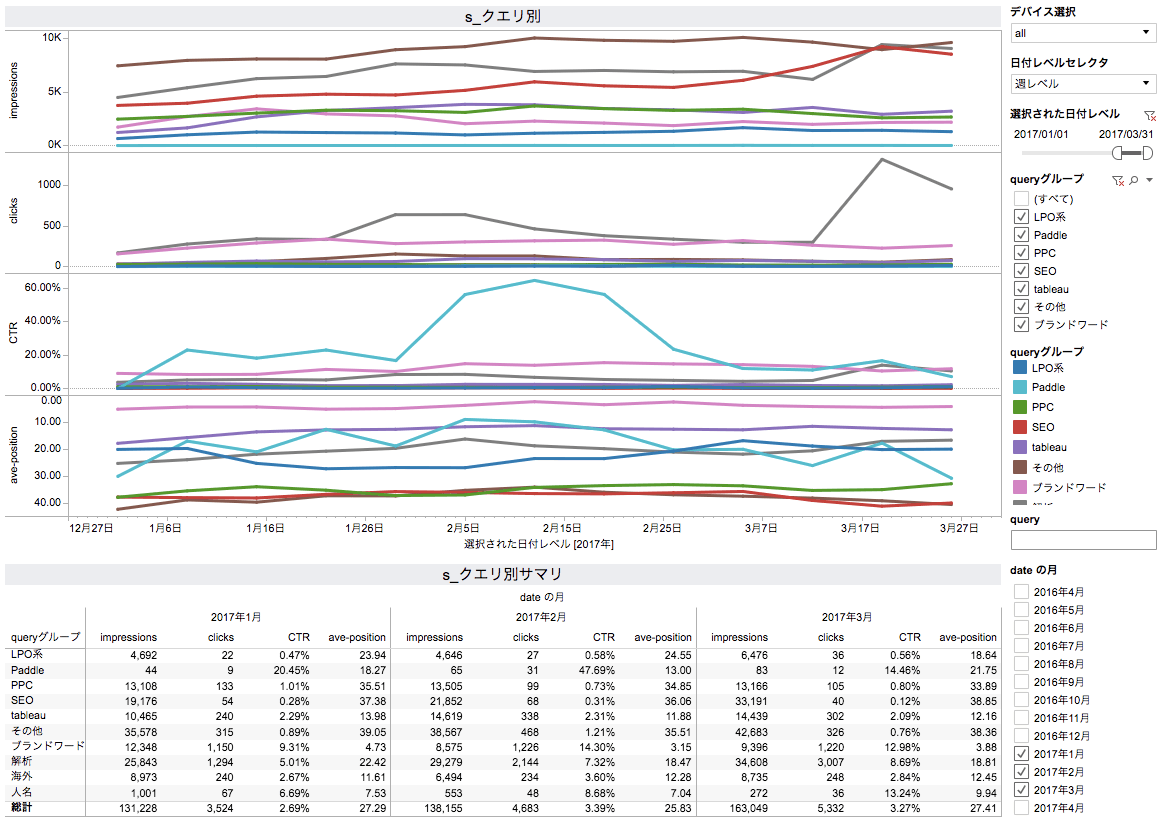 という絞り込みを行うことで、個別クエリでなく、カテゴリベースでのパフォーマンスを追います。エクセルであれば、フィルタや関数を用いることで(XXを含む/含まない)をまとめることができます。