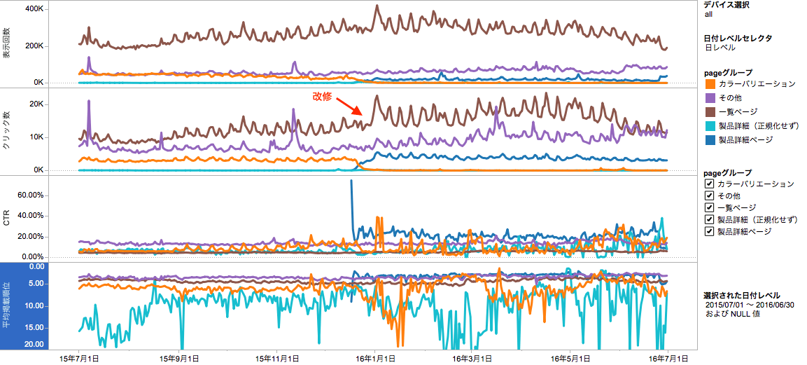 テクニカル面の問題発見〜構造改修を経て、以下のようなパフォーマスの改善を見た例が以下です。(カラーバリエーションページ(オレンジ色)を製品詳細ページ(青)に正規化したことで、製品詳細ページ全体のクリック数が飛躍的に伸びました。)