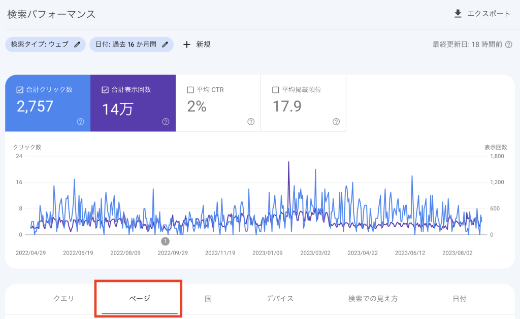 ページのデータは、GSC検索パフォーマンスの「ページ」を選択することで表示、抽出することができます。