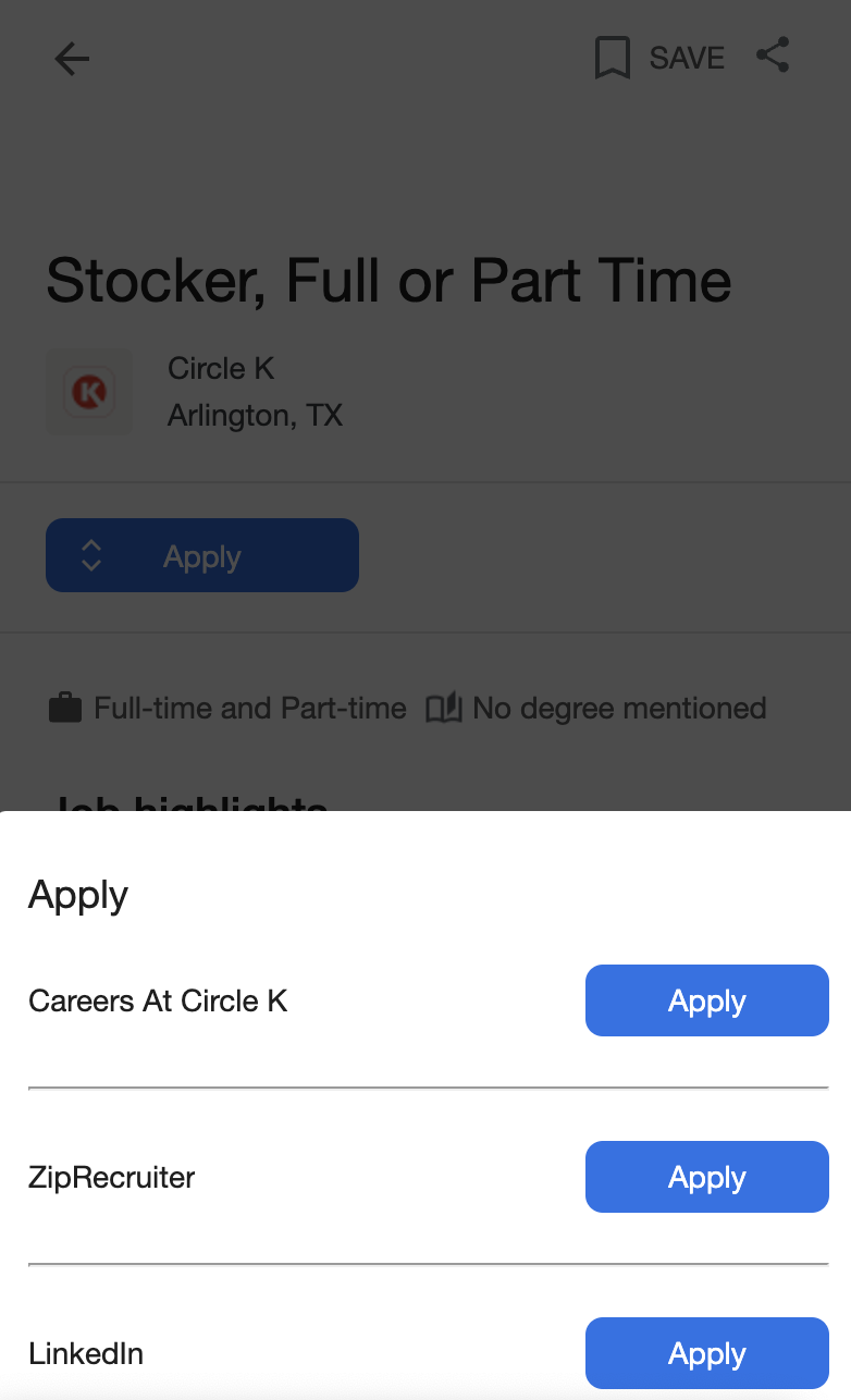 Googleからオフィシャルな公表はありませんでしたが、筆者が把握する限り、8月末に、モバイルページから応募のボタンをクリックすると瞬時にポップアップが表示される仕様に変更されたようです(それ以前は、クリックすると直接求人サイトへ遷移される仕様でした)。