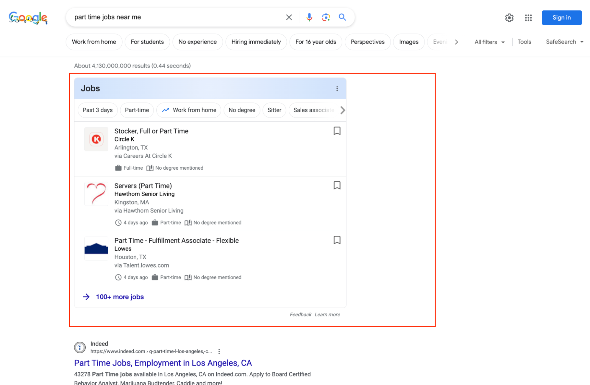 日本で表示されるケースは限りなく少ないが、英語圏では求人媒体が複数表示されている(テスト中の可能性もあるが、将来的には日本語圏も同様の仕様が採用されるかもしれない)。