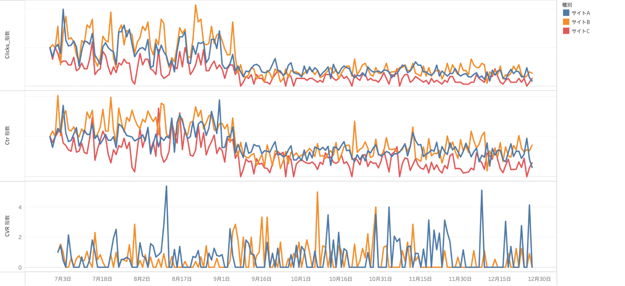 変化の度合いをみるため、各サイトの以下データを指数化しました。
