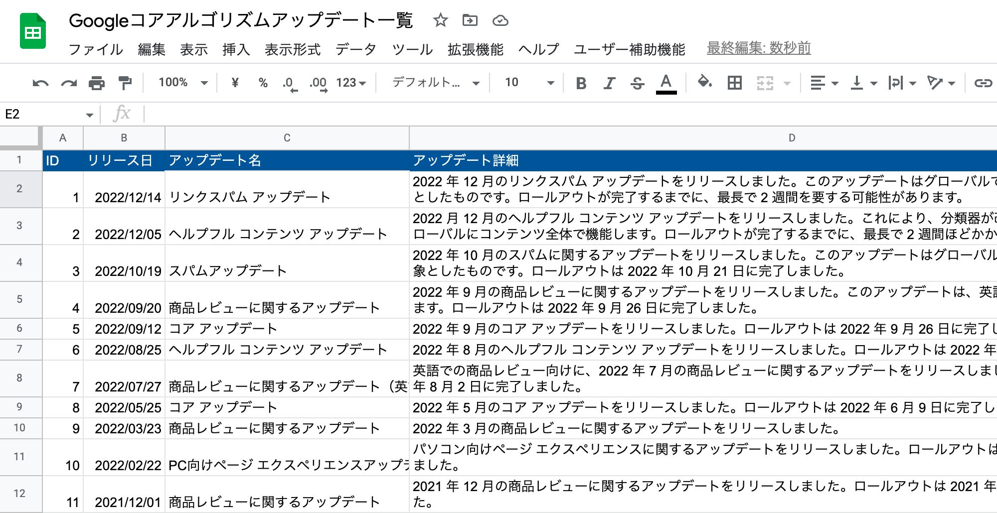 今回はGoogle公式の「コア アップデートを含む Google アルゴリズム アップデート履歴のリスト」ページの情報をそのまま入力しました。