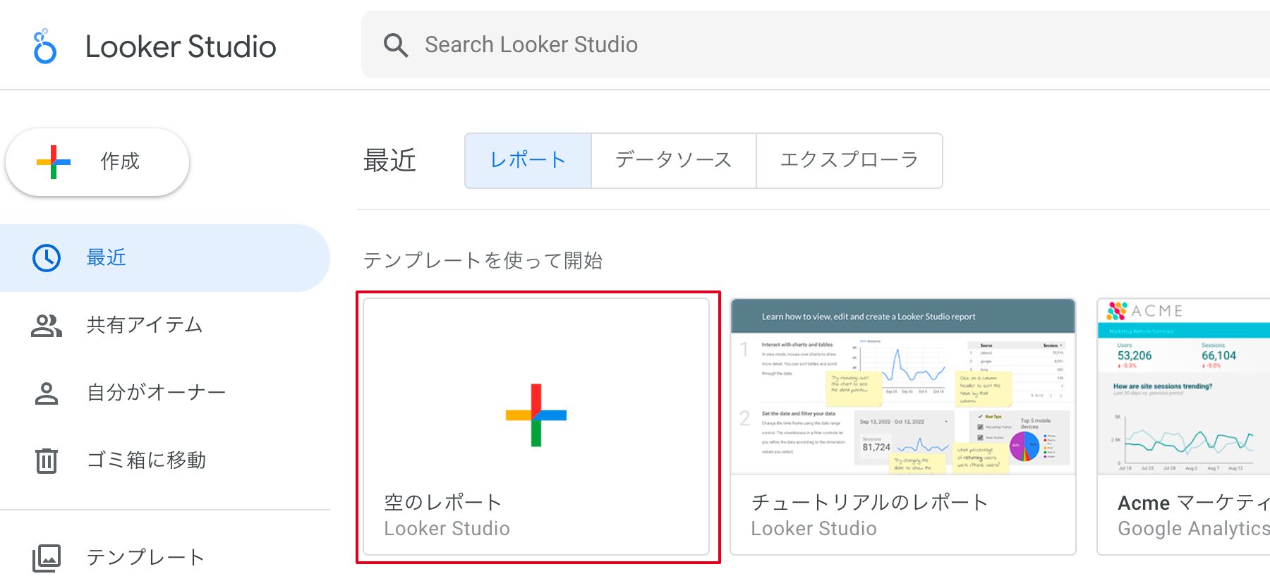 ①Looker Studioを開き、空のレポートを選択します。