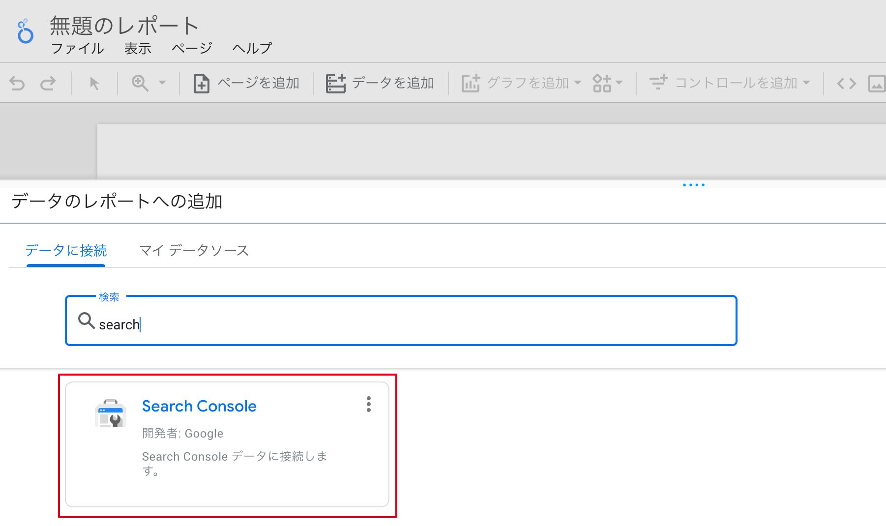 ②データに接続を求められるので、検索ボックスに「search」と入力してSearch Consoleを選択します。