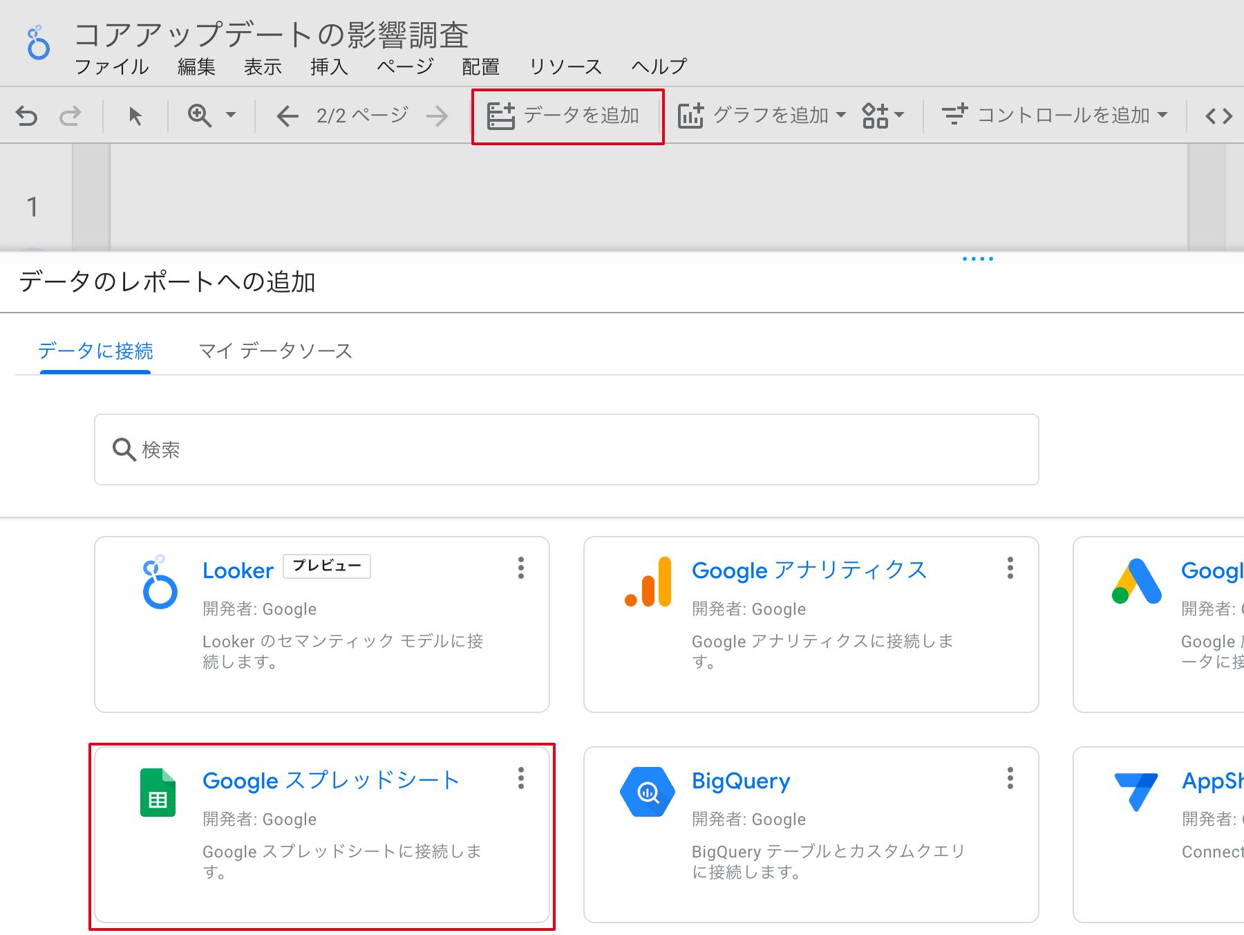 ④上部メニューの「データを追加」からデータソース追加画面を表示させ、「Googleスプレッドシート」を選択します。
