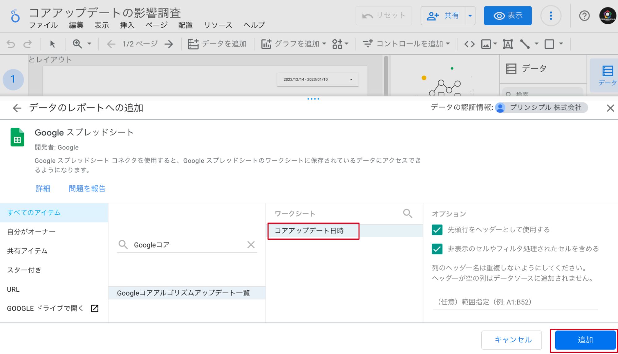 ⑤作成したスプレッドシートを選択し、ワークシートを選択したら「追加」をクリックして追加します。