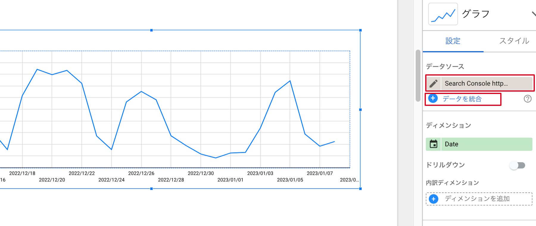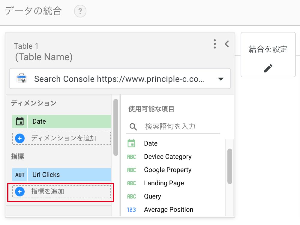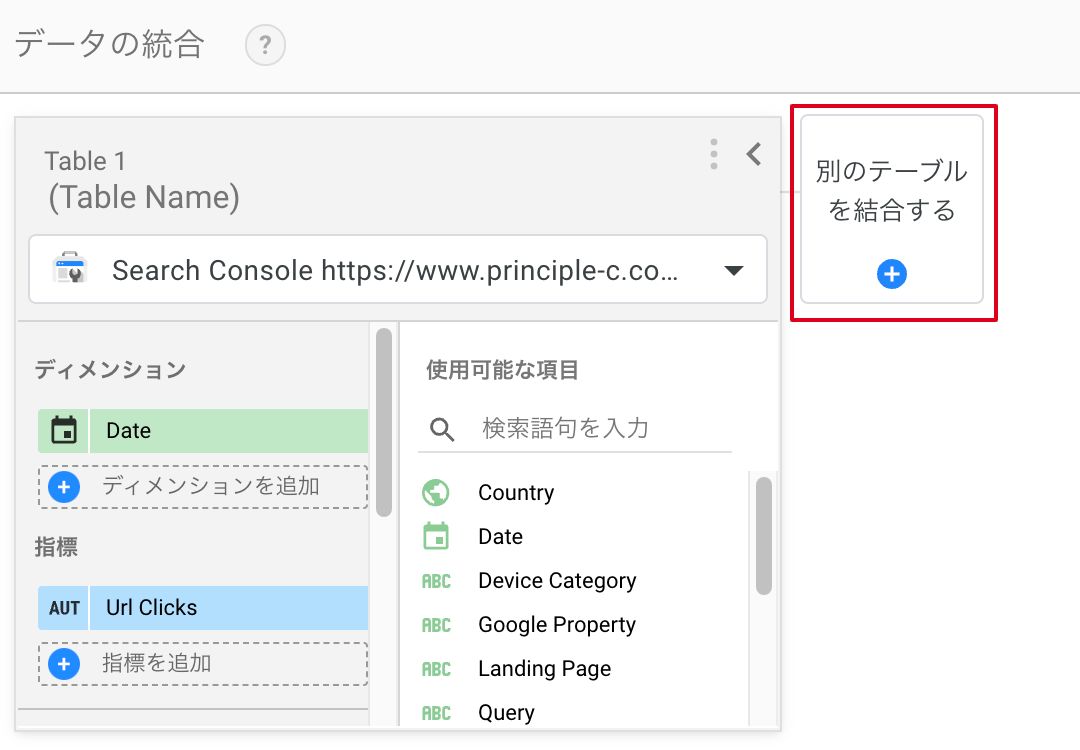 ②追加されたグラフのデータソースが「Search Console」でない場合は変更し、その下の「データを統合」をクリックします。