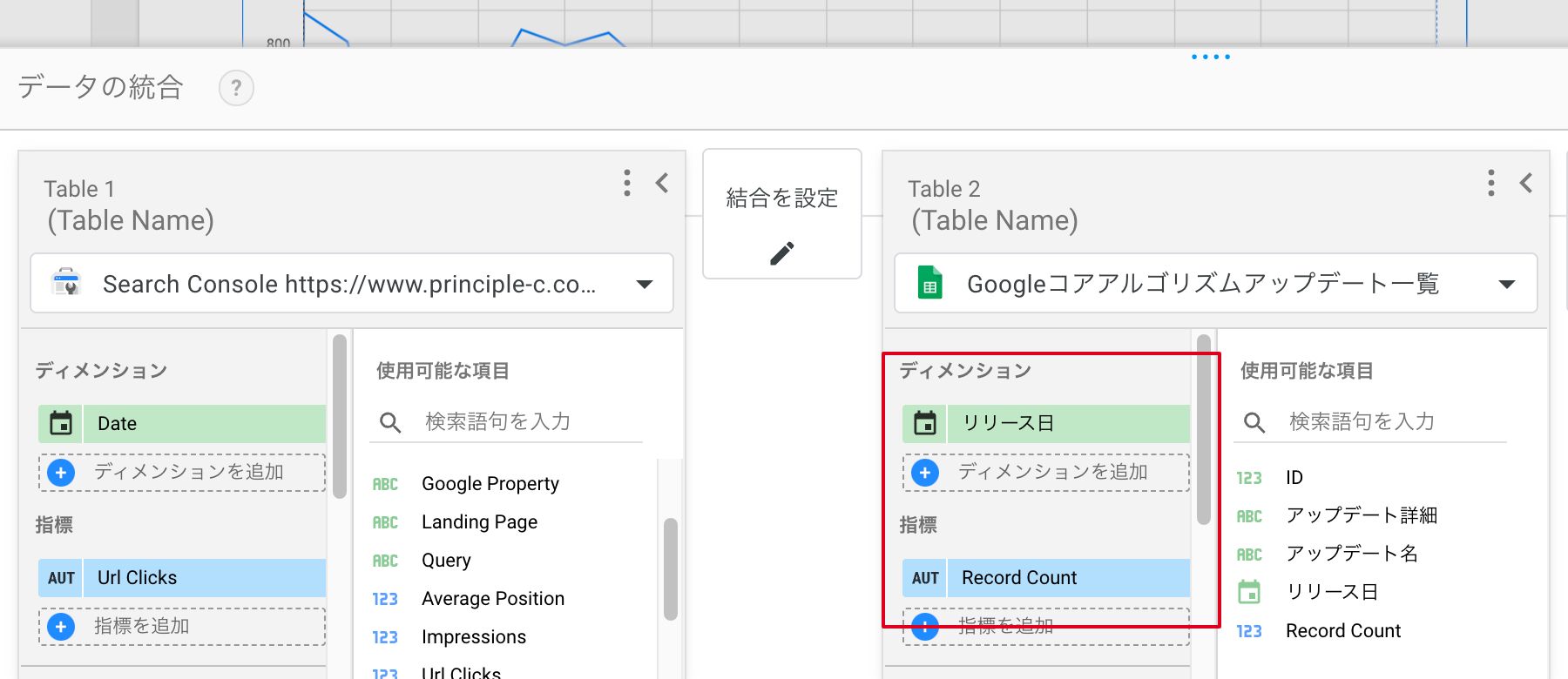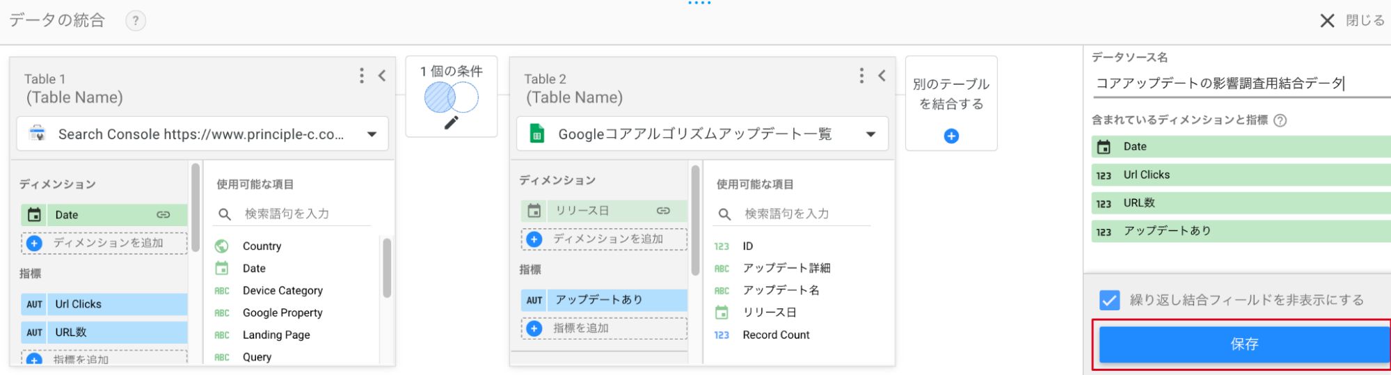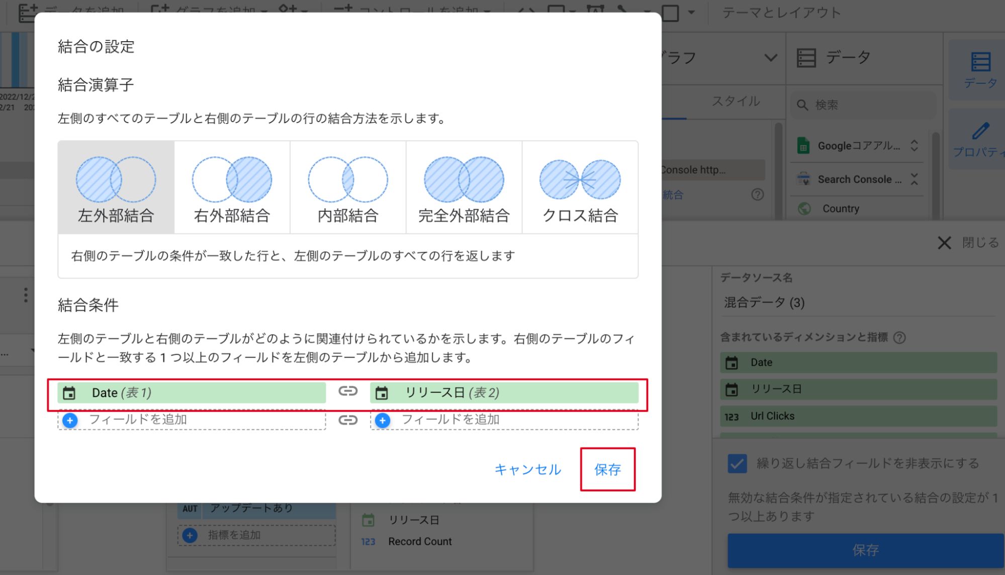 ⑥「結合を設定」をクリックし、「左外部結合」が選択された状態でSearch Console、スプレッドシートそれぞれのデータソースから日付のディメンションを選択し、保存します。