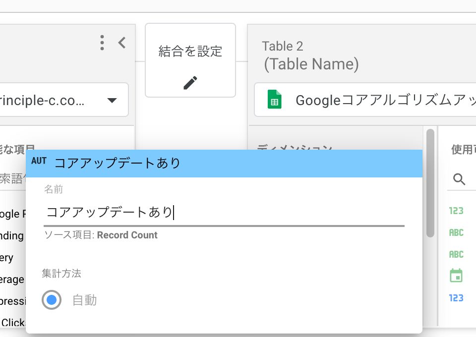 このままでもいいですが、わかりづらいので「Record Count」の左の「AUT」をクリックして指標の名称を「コアアップデートあり」に変更します。