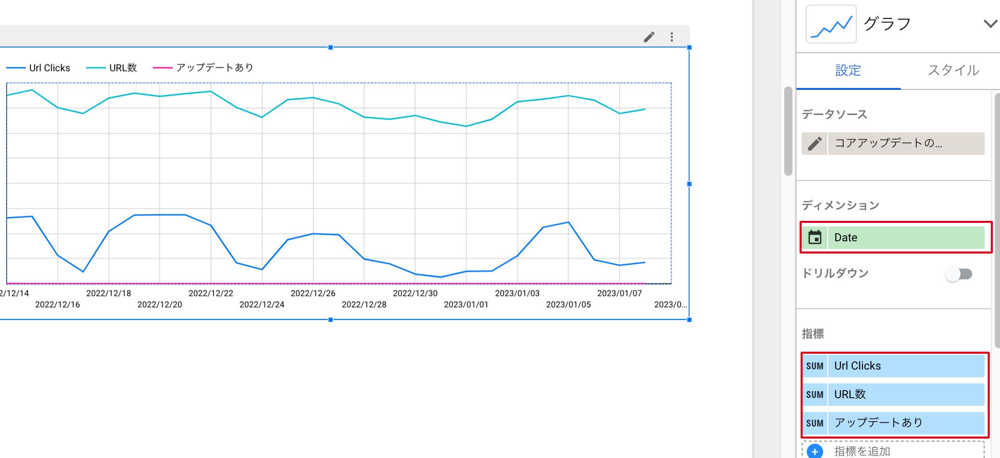 ①ディメンションには「Date」を設定し、指標には「Url Clicks」「URL数」「アップデートあり」を選択します。