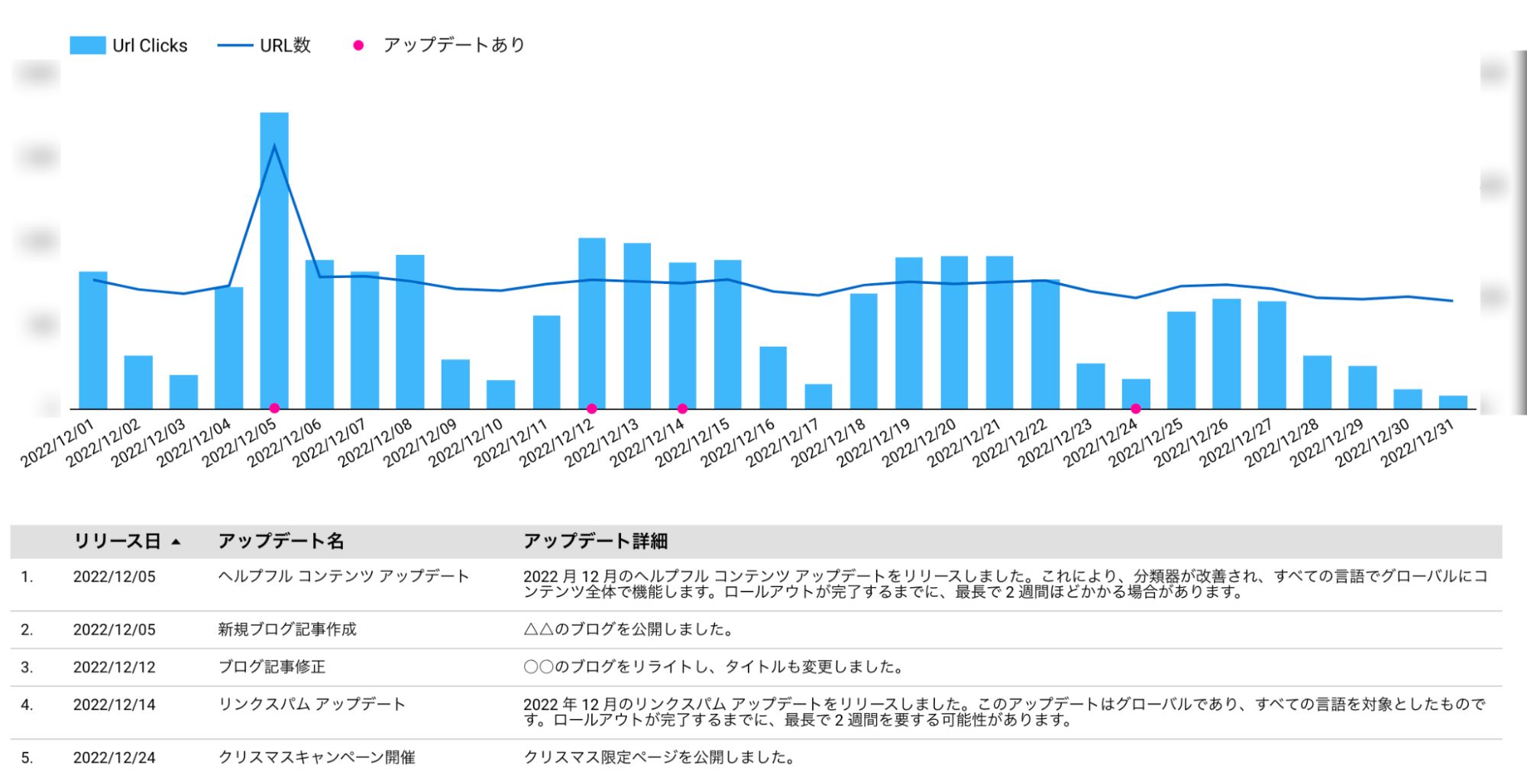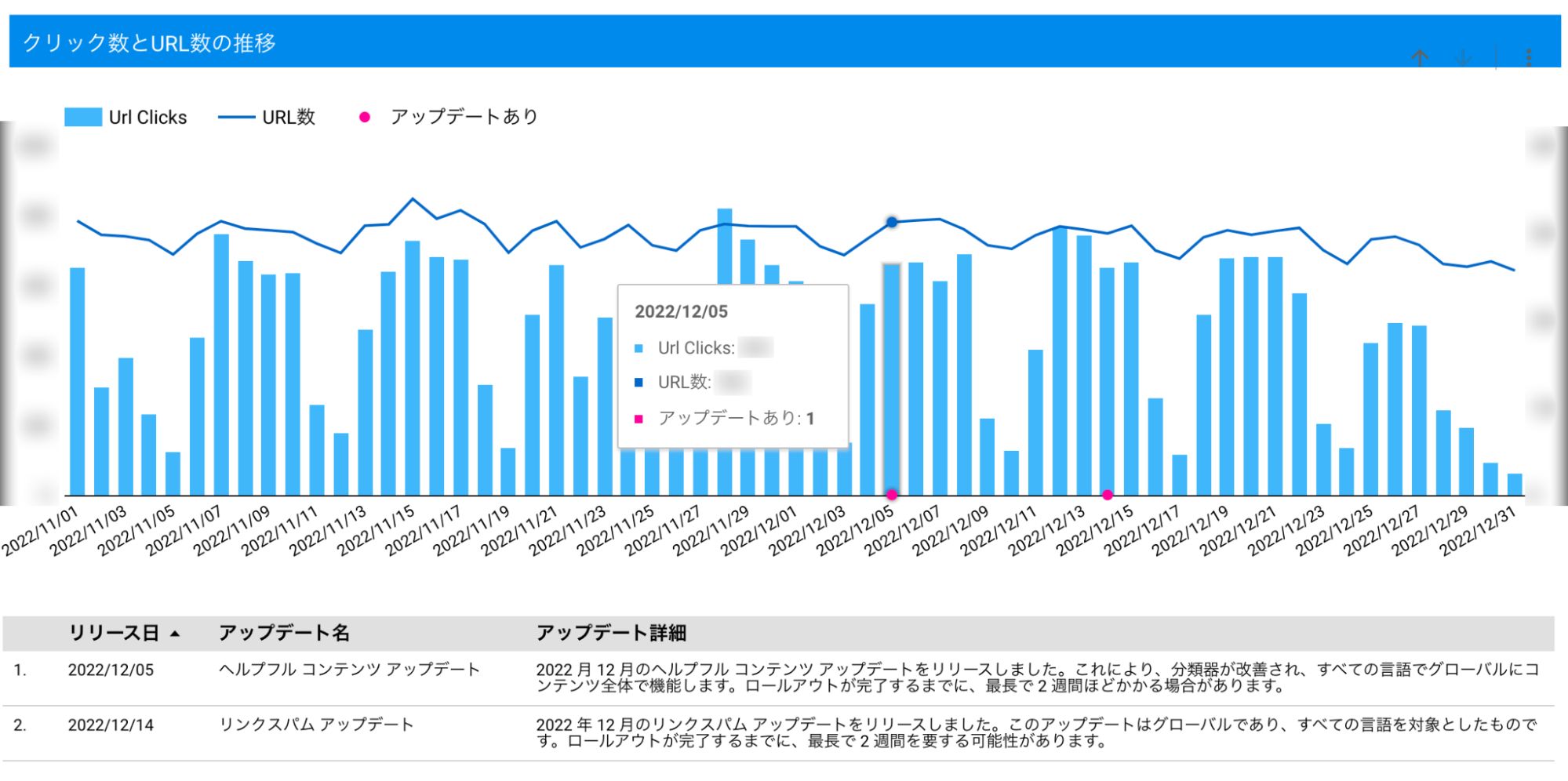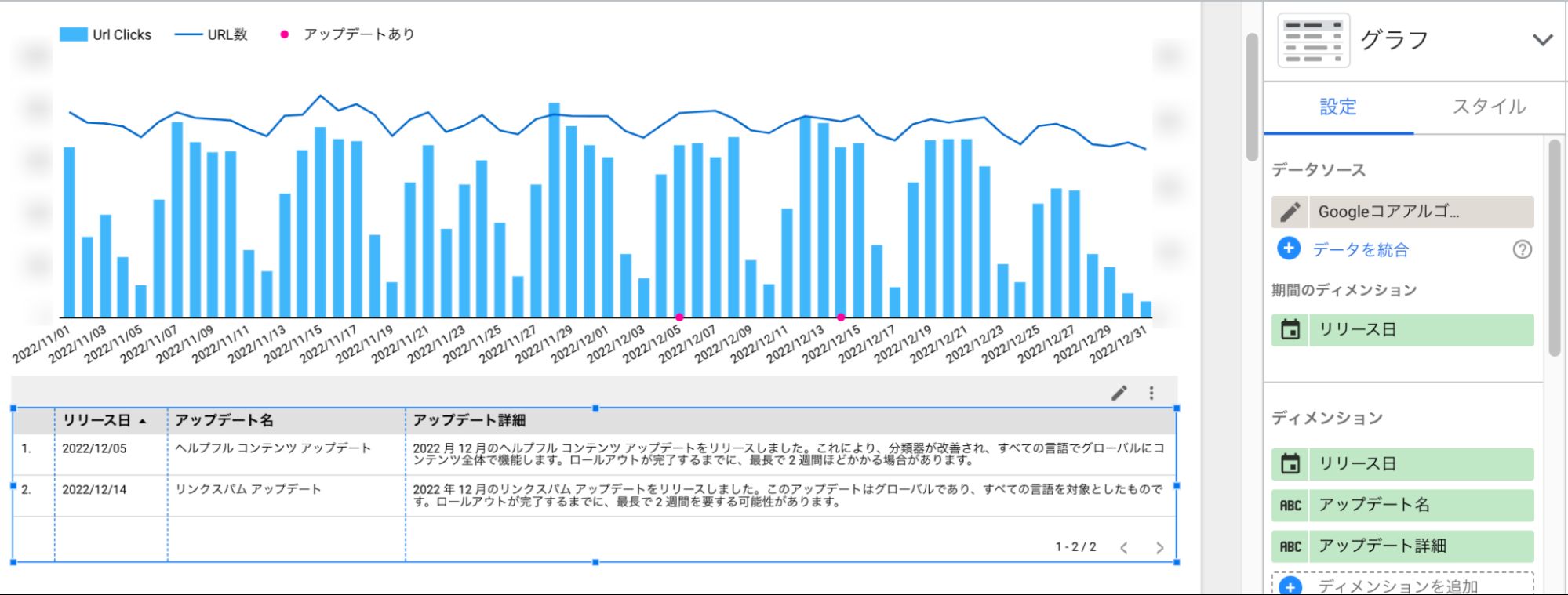 今回はコアアップデートの影響を調べるために、コアアップデートの日付とGoogle Search Consoleのデータを一つのグラフで見られるようにします。また、クリック数(流入数)と検索結果に表示されたURL数を同一グラフ上で見られるようにしたいと思います。