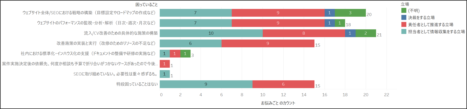 回答者の約3人に1人がSEOやWebサイトに何らかのお悩みを抱えているという結果になりました。その内容も、全体の戦略から具体的な施策まで多岐に渡ります。