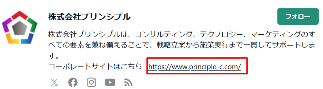 運用中のすべての公式SNSアカウントに、公式サイトのURLを記載するようにし、反対に公式サイトのフッターなどに運用中のすべての公式SNSを網羅して記載します。