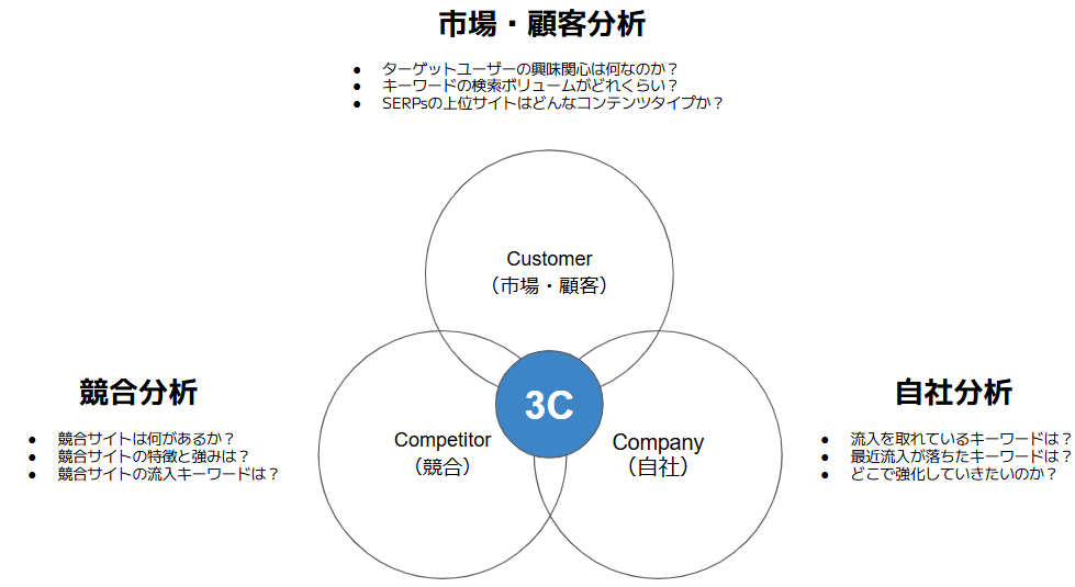 例えば、以下はSEOキーワード選定における3C分析の概念をインフォグラフィックとして表したものになります。(Googleスライドで作成)