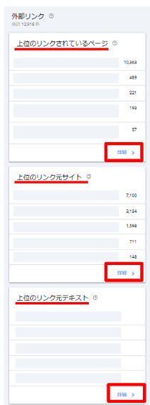 「外部リンク」内には「上位のリンクされているページ」「上位のリンク元サイト」「上位のリンク元テキスト」の3つのレポートがあります。