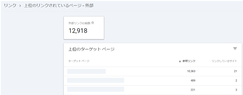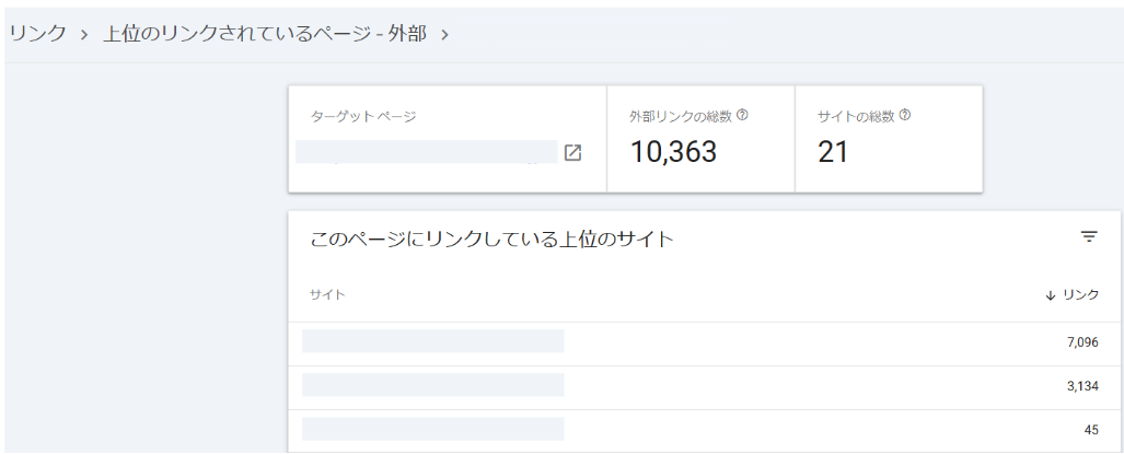 「上位のリンクされているページ」では、自社サイトのページがどのサイトからどれくらい被リンクを獲得できているかを確認できます。「ターゲットページ」は自社サイトのURLで、「参照リンク」は外部サイトのURL数、「リンクしているサイト」は外部サイトの数が表示されています。