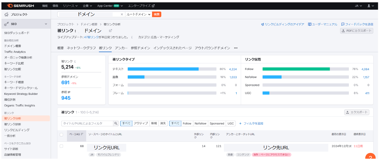 さらに、サイトをクリックすると、その外部サイトが自社の該当URLをリンクしているすべてのURLが表示されます。