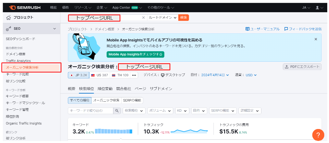 自社サイトのドメインかトップページのURLを入力して、左のメニューから「オーガニック検索分析」というところをクリックします。
