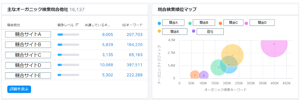 「主なオーガニック検索競合他社」と「競合検索順位マップ」というブロックの「詳細を表示」をクリックします。