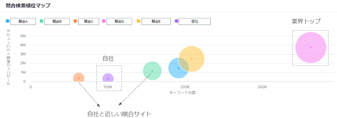 このマップから、競合の中でもD社は、キーワード数もトラフィックも圧倒的に多く獲得しており、業界トップに位置することが分かります。