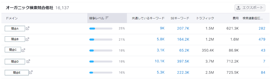 オーガニック検索競合他社では、競争レベルを含めて、各競合サイトの詳細情報が記載されています。
