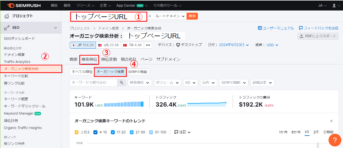 • ステップ④ 「オーガニック検索」というタブを選択。
