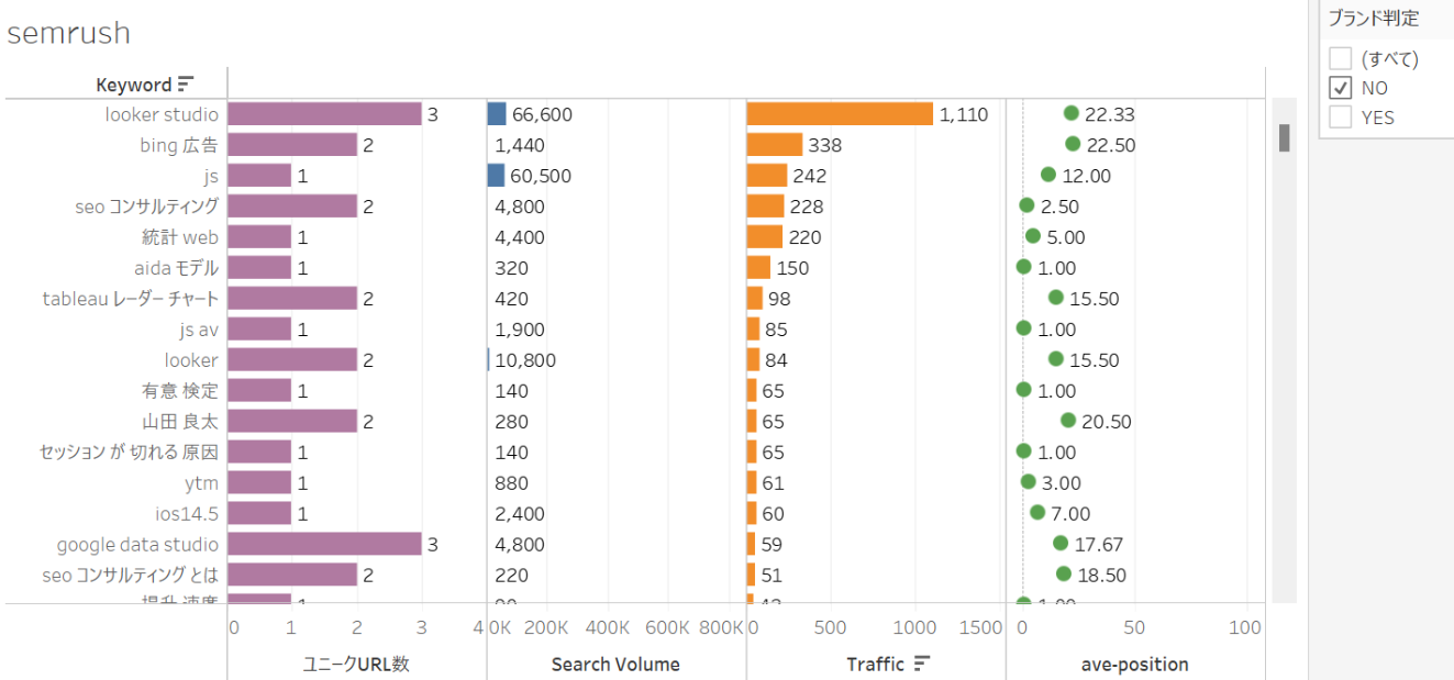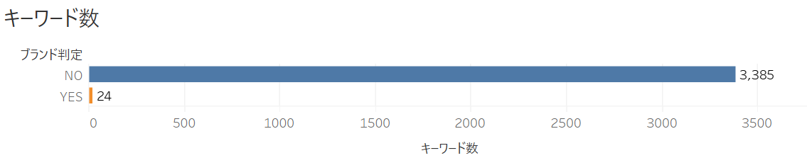 このグラフでわかることは、弊社サイトはほとんど非指名系キーワードで流入を獲得していることです。他の競合サイトでも同じように分析すると、指名系キーワードの数と割合で比較して、競合サイトのブランド認知度の優劣が分かります。
