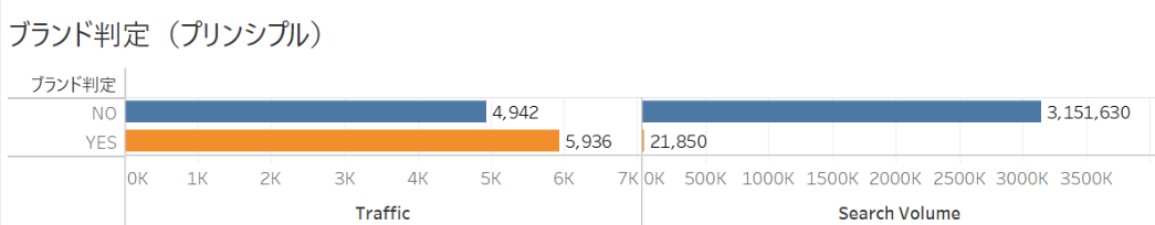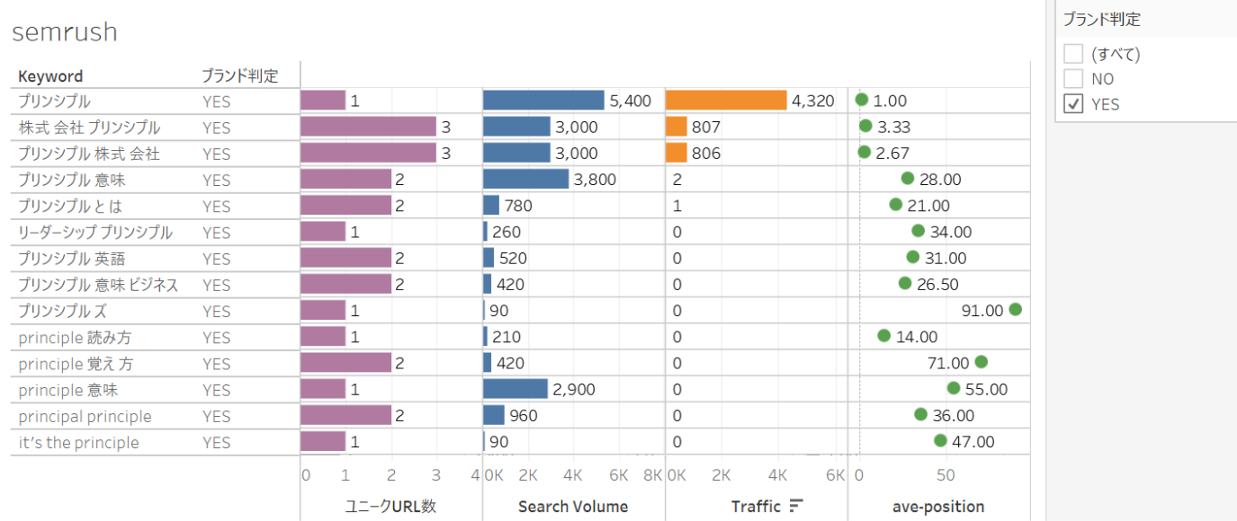 ブランド判定というのは、弊社の場合「プリンシプル」か「principle」といったワードが含まれていると指名系キーワードで、それ以外は非指名系キーワードになります。(例:「SEO プリンシプル」であれば指名系キーワード、「SEO コンサル」であれば非指名系キーワード)