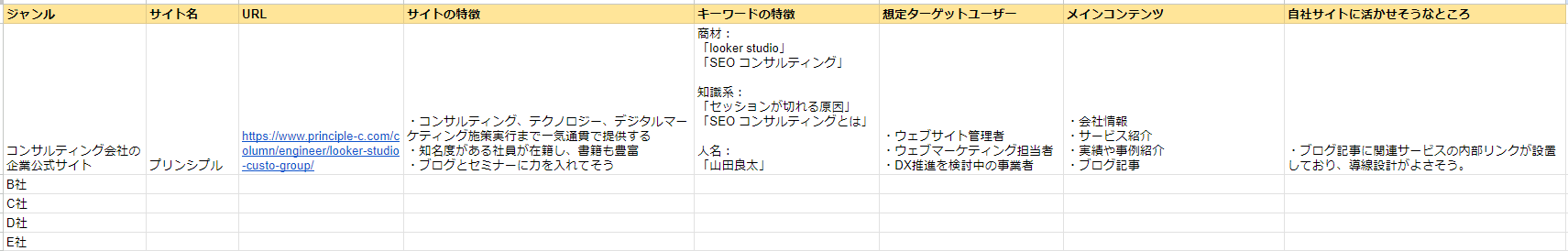 項目には各競合サイトの「ジャンル」「サイト名」「URL」「サイトの特徴」「キーワードの特徴」「想定ターゲットユーザー」「メインコンテンツ」「自社サイトに活かせそうなところ」があります。