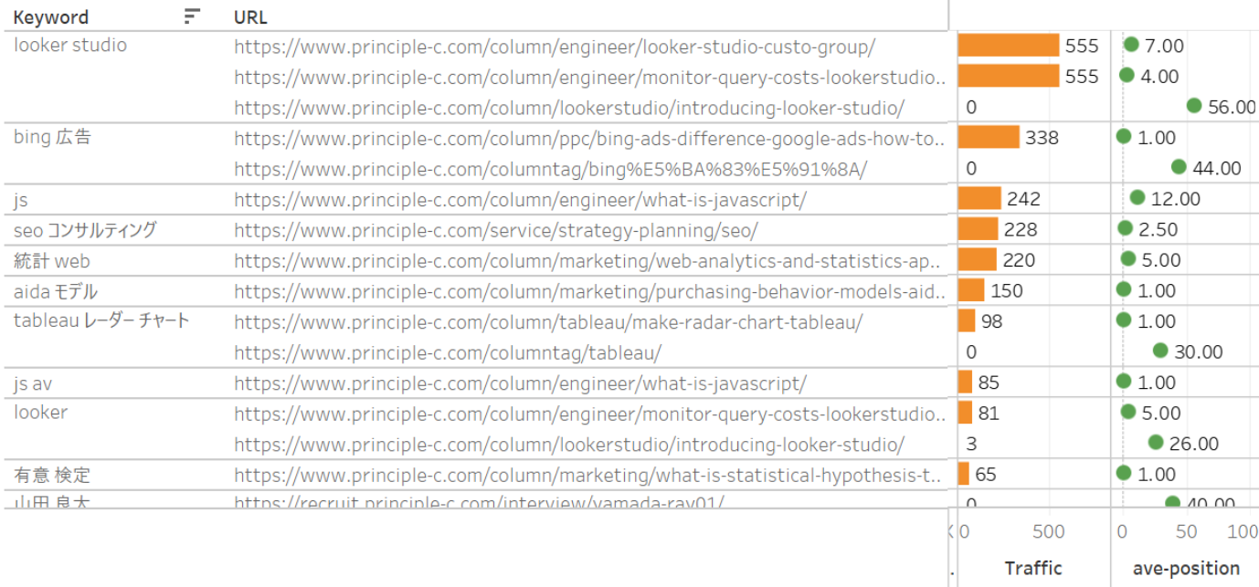 下記のようなキーワードとランディングページ、トラフィックと検索順位が一覧できるようなものを用意しておくと分析しやすいです。